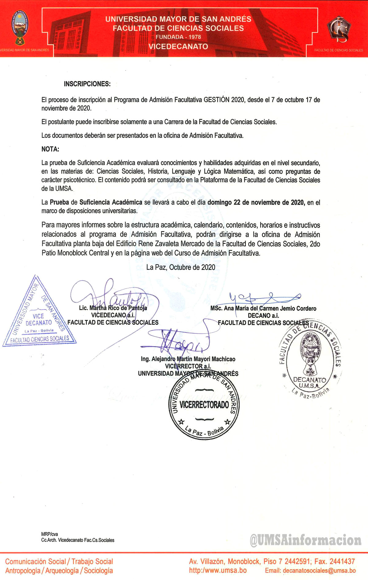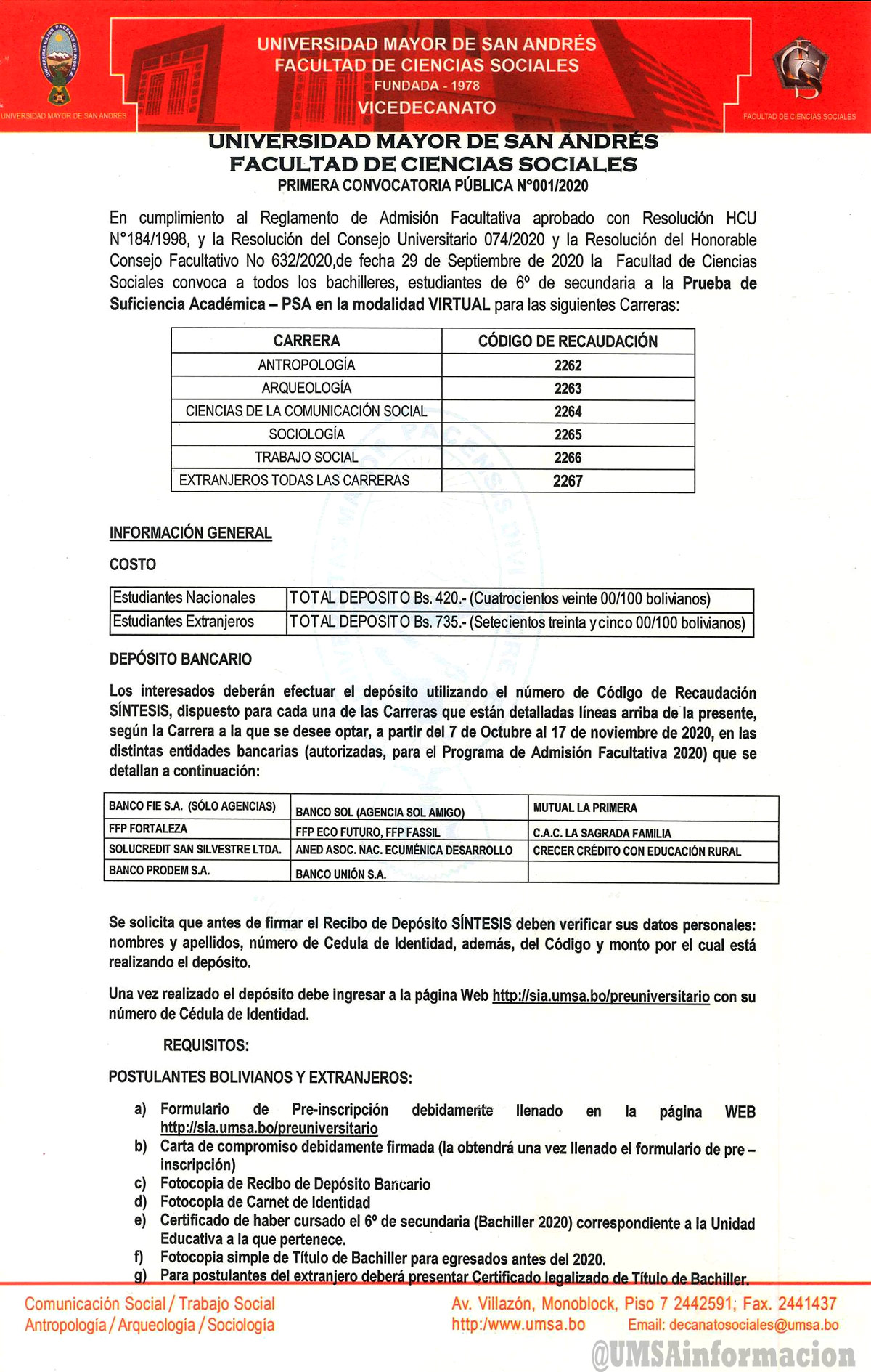 (La UMSA). La Facultad de Ciencias Sociales de la Universidad Mayor de San Andrés (UMSA) convoca a los interesados a postularse a la Prueba de Suficiencia Académica Modalidad Virtual.