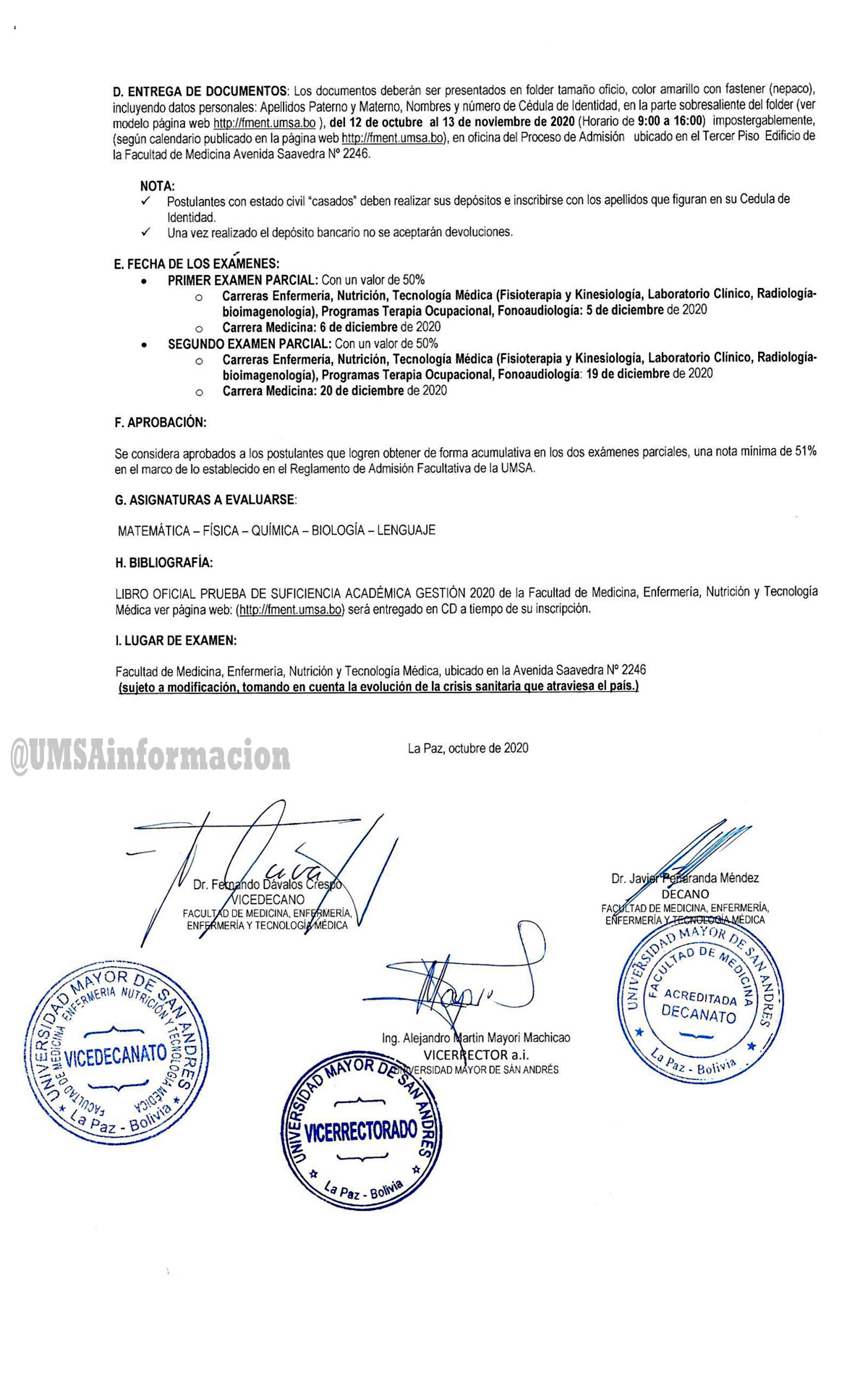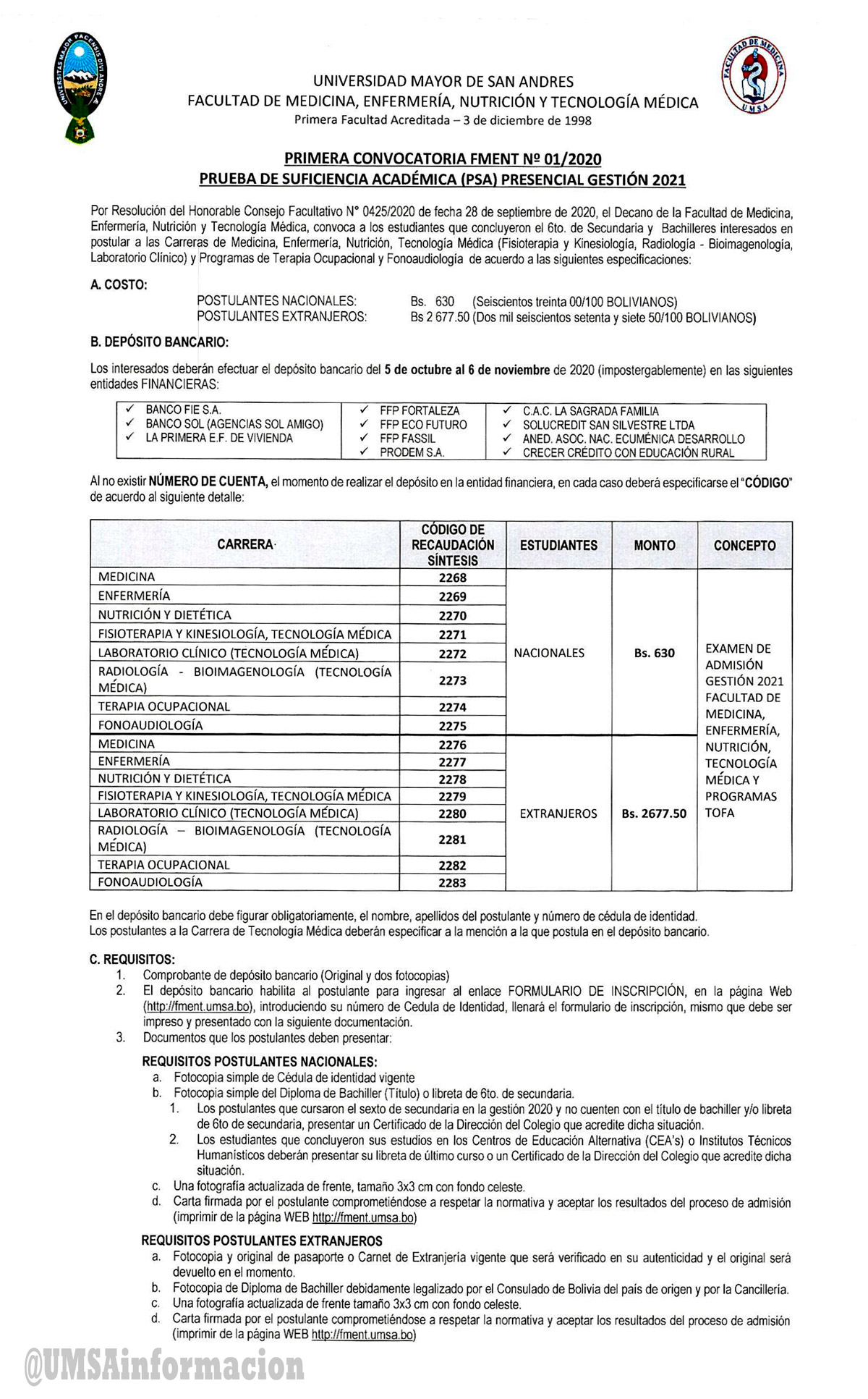 (La UMSA). La Facultad de Medicina, Enfermería, Nutrición y Tecnología Médica de la Universidad mayor de San Andrés (UMSA) convoca a los interesados a inscribirse a la Prueba de Suficiencia Académica.