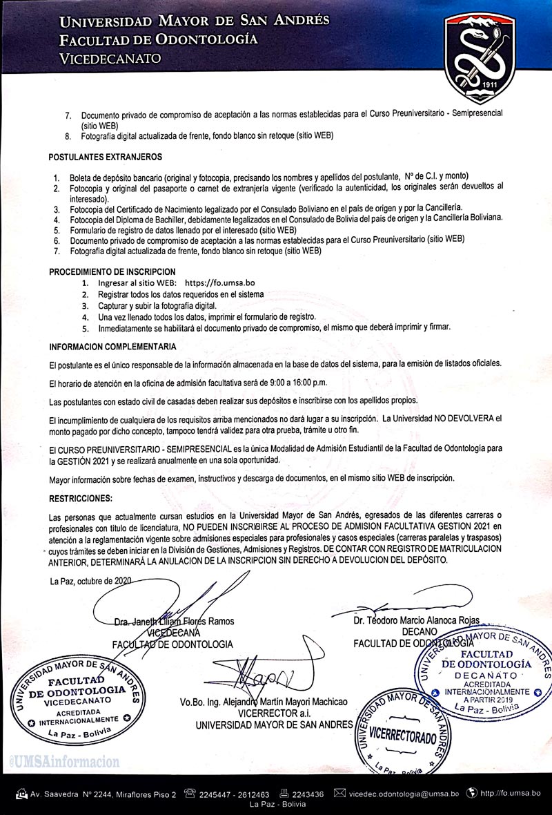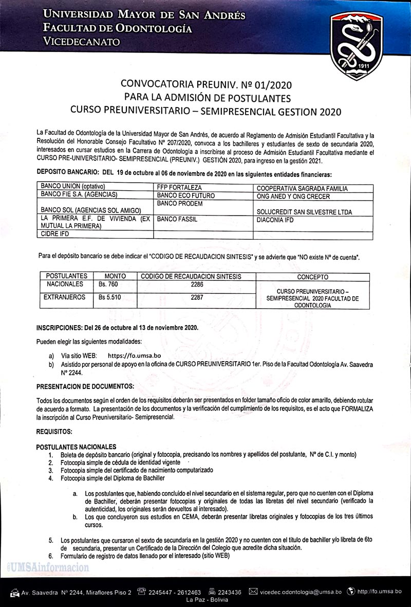 (La UMSA). Convocatoria para la Facultad de Odontología en la Universidad mayor de San Andrés (UMSA).