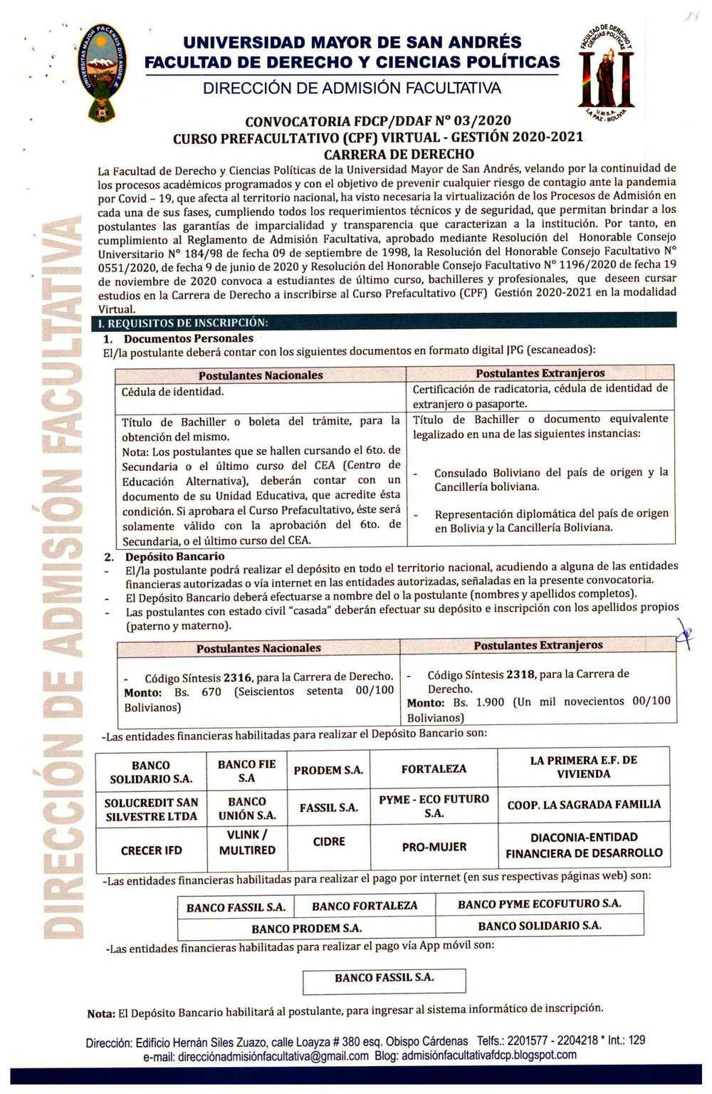 (La UMSA). Convocatorias 2021 para la Universidad Mayor de San Andrés (UMSA).