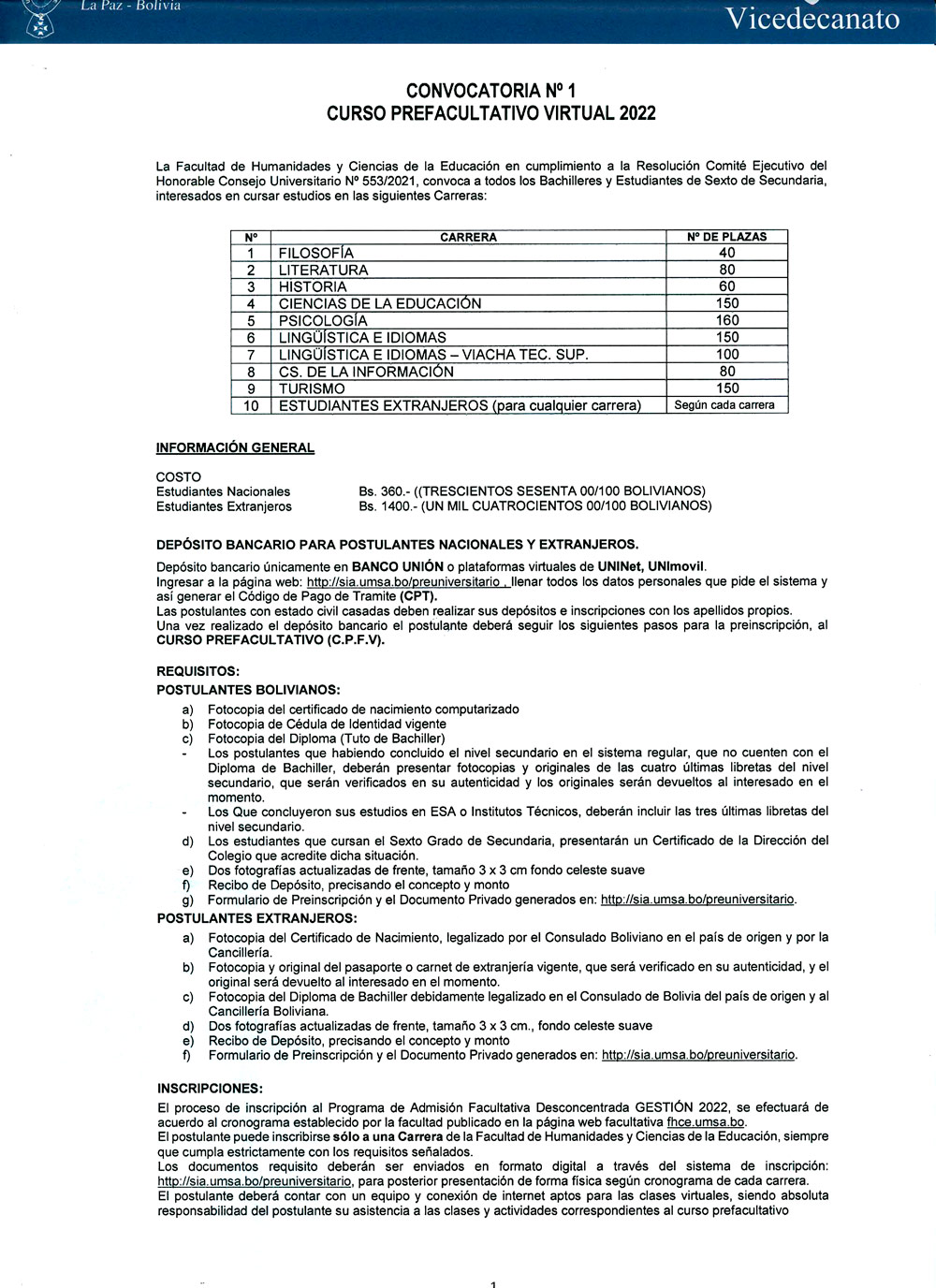 ➡ CONVOCATORIA:Para estudiantes sexto de secundaria, bachilleres y profesionales que deseen inscribirse Curso Pre-Facultativo Virtual 2022 de La Facultad de Humanidades y Ciencias de la Educación, para las siguientes Carreras: