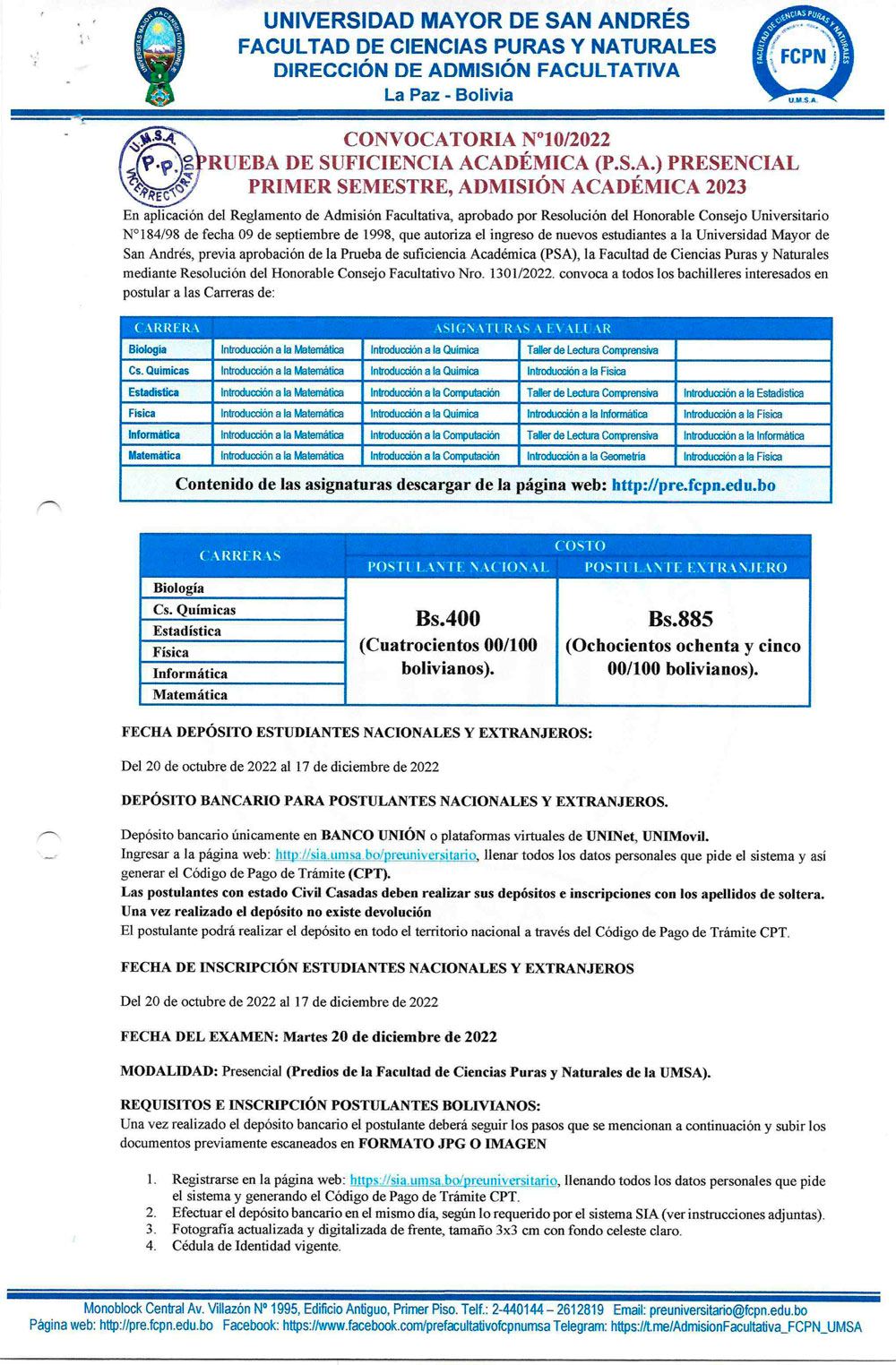 • Grupo telegram: https://t.me/UMSA_FCPN_PSA_1_2023 (de lunes a viernes en horarios de oficina de 09:00 a 16:00)